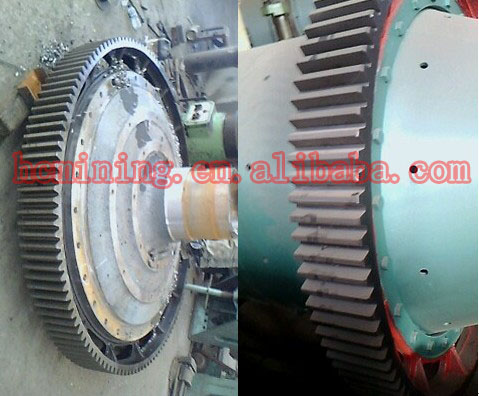 本機(jī)由給料部、出料部、回轉(zhuǎn)部、傳動(dòng)部(減速機(jī),小傳動(dòng)齒輪,電機(jī),電控)等主要部分組成。中空軸采用鑄鋼件,內(nèi)襯可拆換,回轉(zhuǎn)大齒輪采用鑄件滾齒加工,筒體內(nèi)鑲有耐磨襯板,具有良好的耐磨性。本機(jī)運(yùn)轉(zhuǎn)平穩(wěn),工作可靠。